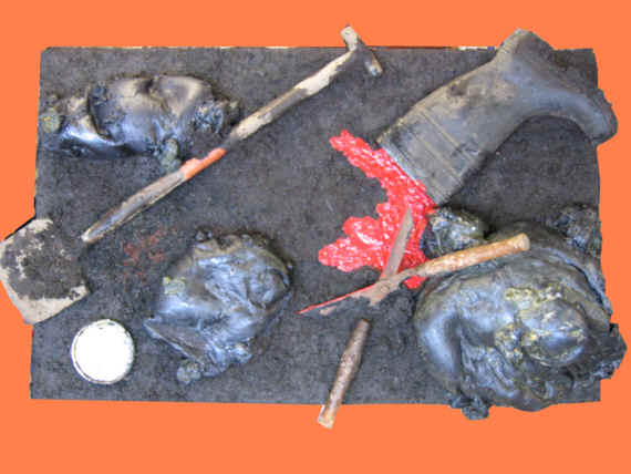 £1500 H25in x W49in 3D 63.5cm x 124.5cm) painting using acrylic paint, gypsum,wire, rubber, cloth, sawdust, paper, sacking on plywood 27-06-04 |