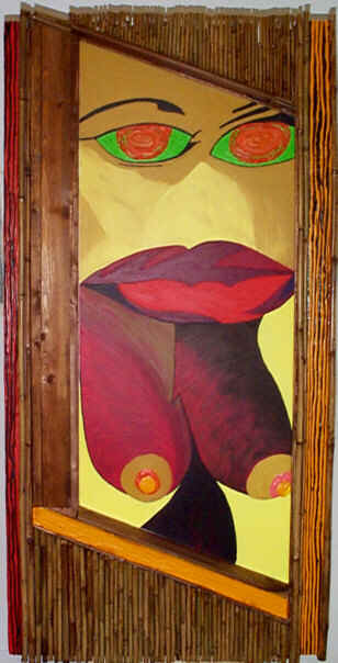 H157cm W77cm) Dated: 15-11-1998 Medium: Acrylic on reinforced hardboard framed with bamboo Price: £ 750 or $ 1050 From the same photograph by Gian Paulo Barbieri (Painting no 2.35 and no 2.38). I have painted a 3rd version incorporating bamboo. This is a more dramatic and interresting painting. The use of bamboo to frame the nude helps to express her earthiness and brings out other aspects of her fullsome character. Following this painting, I shall paint one more version, a "New Realism" detailed work. I am looking forward to this quite different challenge - to paint a visually authentic version. |