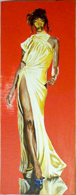 | Naomi Campbell H48in W18in (H122cm W46cm) Dated 28-6-97 Price £300 $420 Acrylic on hardboard From Hullo dated a few months before. I get fed up of reportage. Sometimes you just want to paint something because it looks nice. The fashion photo of Naomi was so perfect, so sleek, the dress so beautifully draped that, it had to be painted. This is a case where the painter is unworthy of mention and perhaps should not tamper with the original. The photographer is the superior creator but he had to have the right material. The dress designer has to be the best of the three and what about the model as artist. She had to know how to hang the clothes on her body for them to look so perfect. That is teamwork. The onlooker can only appreciate and enjoy such a creation which I did in painting it. |