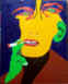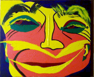 | Richard Beaming. H20 x W24 inches. 51cm x 61cm Dated 7-1-98 Price £100 $140. Acrylic on hardboard From a photo by Margaret The semi-abstract art form frees you to paint a mood free of the disciplines of strict and accurate realism. Richard had a wide, contented smile assisted by some festive spirits at Christmas. The bright colours express his light and happy mood. |